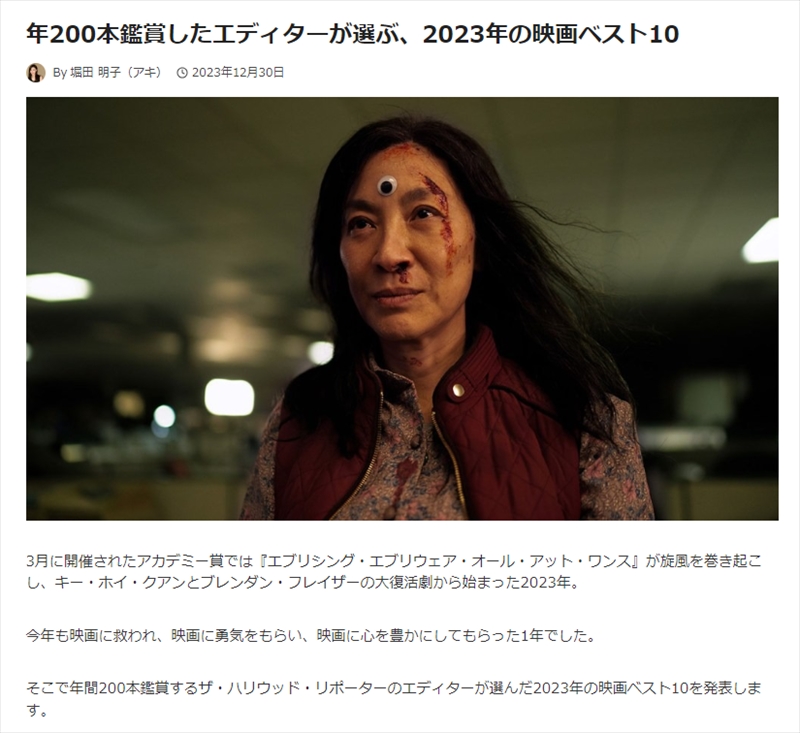 ちなみに、アキさんは、「ハリウッド・リポーター」の「年200本鑑賞したエディターが選ぶ、2023年の映画ベスト10」という記事を書かれています。名門誌を代表してベストテンを選ぶのは素晴らしいですし、「枯れ葉」といった渋い作品を入れているのも嬉しいですね。なお、「一条賞(映画篇)」の大賞はアカデミー賞でいえば「作品賞」ですので、他の各賞も以下のように発表いたします。昨年から一条賞オリジナルということで、SF映画賞、ホラー映画賞を発表。今年からは、ミステリー映画賞、アクション映画賞、グリーフケア映画賞、配信作品賞、レジェンド映画に贈る特別作品賞も新設しました。
